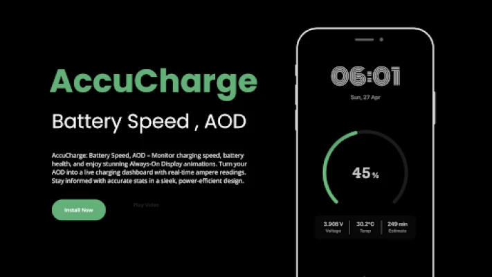 Το AccuCharge: Battery Speed, AOD μεταμορφώνει το τηλέφωνό σας σε έναν έξυπνο κόμβο μπαταρίας. Αποκτήστε πλήρη έλεγχο με ταχύτητα φόρτισης σε πραγματικό χρόνο, ακριβή ποσοστά, λεπτομερή στατιστικά υγείας και πληροφορίες χρήσης. Όλα αυτά με κομψή διεπαφή και υποστήριξη Always-On Display.