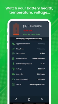 Εμβαθύνετε στην κατάσταση της μπαταρίας σας με την ολοκληρωμένη αξιολόγηση υγείας και τις αναλυτικές στατιστικές φόρτισης, που περιλαμβάνουν τάση, ρεύμα και ισχύ. Το Ampere Meter Charger Tester παρέχει επίσης πληροφορίες για το ρεύμα αποφόρτισης σε mA, δίνοντάς σας μια σαφή εικόνα της κατανάλωσης ενέργειας της συσκευής σας. Χάρη στην λειτουργία αυτόματης ανανέωσης, όλα τα δεδομένα παραμένουν ενημερωμένα, παρέχοντας σας άμεση και ακριβή πληροφόρηση. Όλα αυτά παρουσιάζονται μέσα από ένα διαισθητικό και φιλικό προς τον χρήστη περιβάλλον, καθιστώντας την εφαρμογή προσβάσιμη σε όλους, ανεξάρτητα από τεχνικές γνώσεις. Είτε είστε λάτρης της τεχνολογίας είτε απλά θέλετε να διατηρήσετε τη συσκευή σας σε άριστη κατάσταση, το Ampere Meter Charger Tester είναι το απαραίτητο εργαλείο.